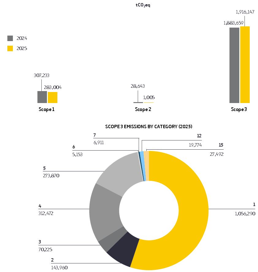 Emissions from carbon credits or allowances purchased, sold or transferred have not been included in the calculation of indirect GHG emissions when generating energy (Scope 2). In terms of scope 2 consumption of electricity, heat and cooling: 23.2% originate from Energy Attribute Certificates (EACs), 25.7% from self-consumed electricity of 100% renewable sources, 49.8% from renewable electricity contracts with suppliers and 1.3% from non-renewable district heating supply.