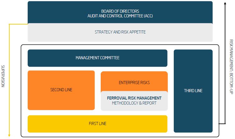 The Board of Directors is responsible for establishing the level of risk the Company is willing to assume in the course of its activities (Ferrovial’s risk appetite), as well as for designing, implementing, and maintaining appropriate internal risk management and control systems that enable the achievement of its strategic objectives.
